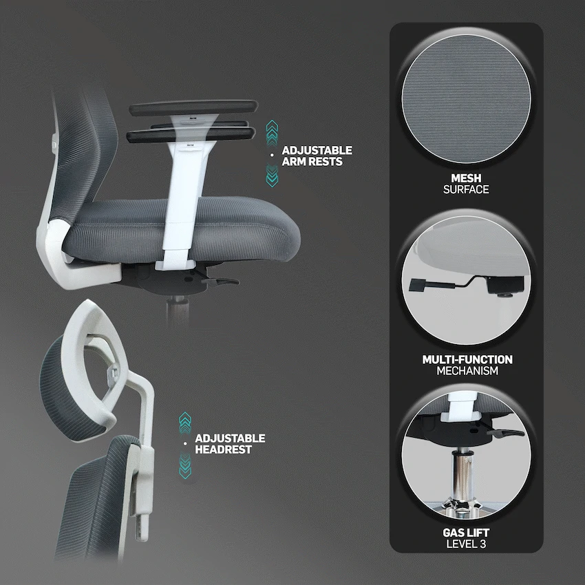 Adjustable Headrest & Armrests: Customizable height and angle for a personalized fit, enhancing overall support.