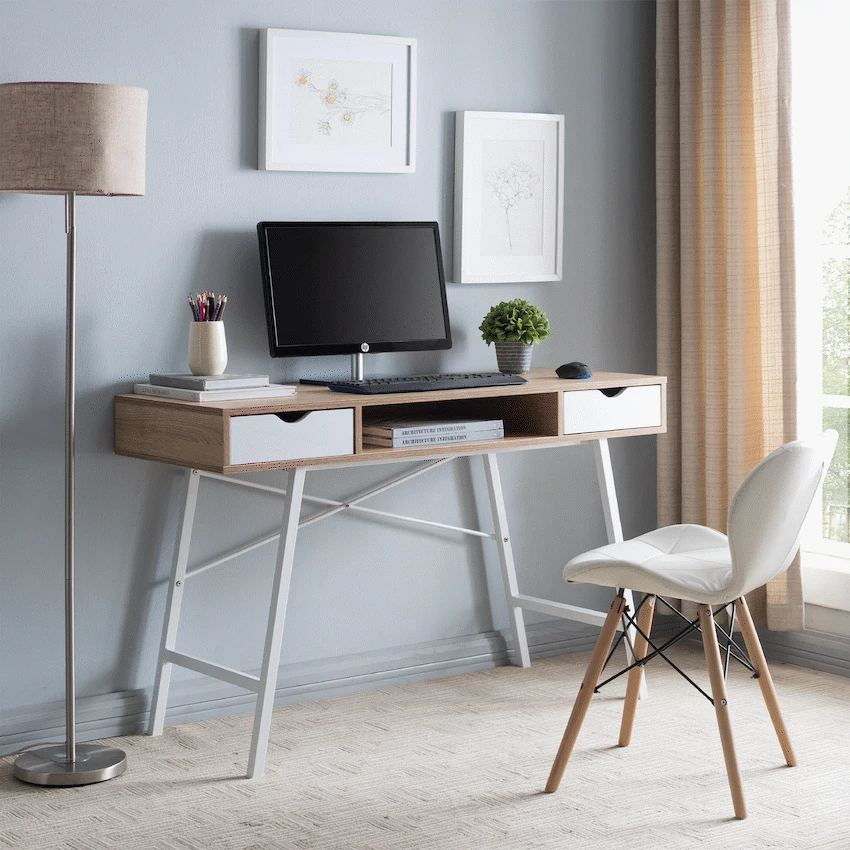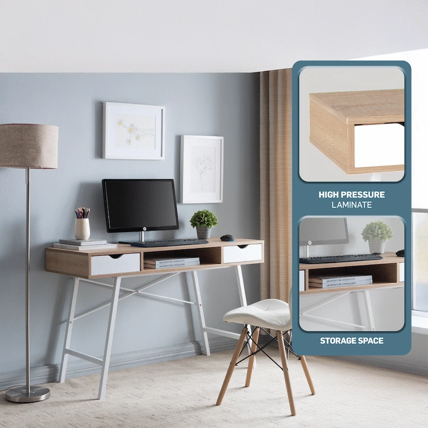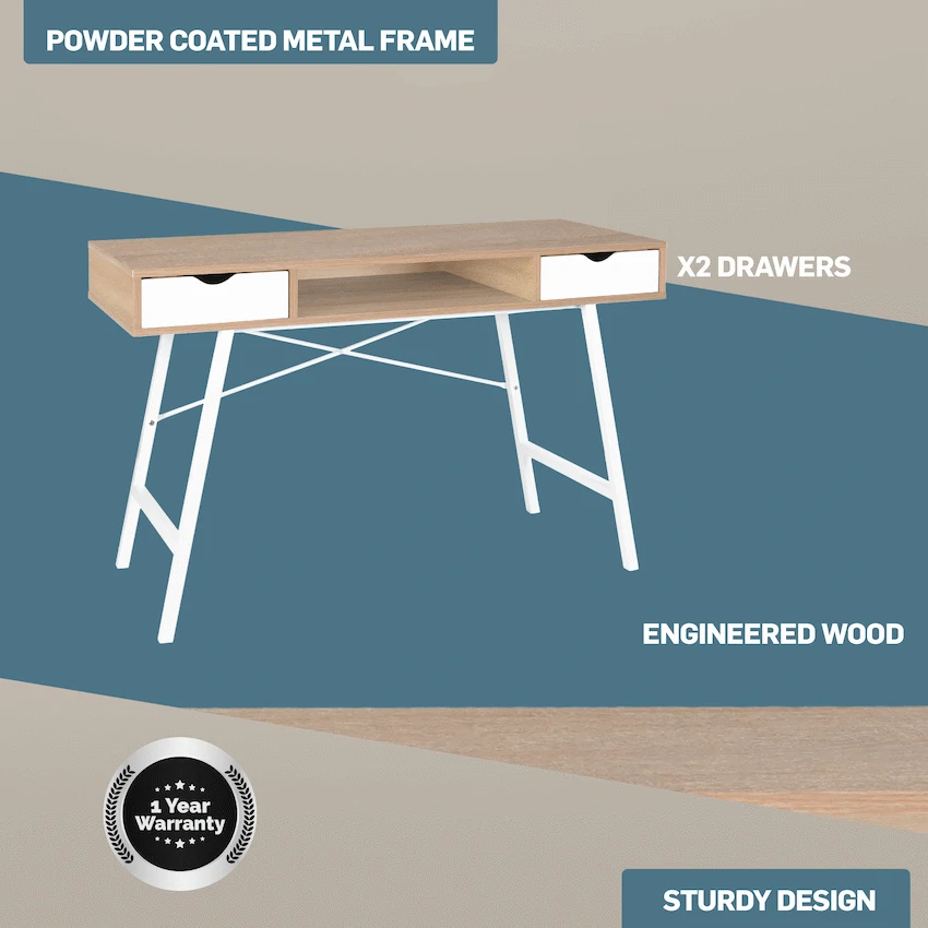 Create a comfortable and organised workspace with the Everfurn Rain Work Desk, a versatile study desk with drawers designed for everyday productivity. Whether you’re setting up a home office, study area, or compact workspace, this office desk with drawers offers a durable surface, smart storage, and a strong steel frame you can rely on. The desk features a high-pressure laminate work surface that is durable and easy to clean, making it ideal for daily use. Supported by a powder-coated metal frame, it delivers excellent strength and resistance to rust, ensuring long-lasting performance. The two integrated drawers keep stationery, documents, and essentials neatly organised and always within reach, helping you maintain a clutter-free workspace. Designed with practicality in mind, the adjustable feet allow the desk to remain stable even on uneven floors—perfect for home offices and shared living spaces. With its generous 1200mm width, this home office desk provides ample room for laptops, monitors, books, and accessories without overwhelming your space. Combining durability, functionality, and clean modern styling, the Everfurn Rain Work Desk is a dependable solution for studying, working, and staying organised every day. Feature Highlights Durable Laminate Surface – Easy-clean, high-pressure worktop for everyday use Strong Steel Frame – Powder-coated metal construction for strength and rust resistance Two Storage Drawers – Keep work essentials organised and within easy reach Adjustable Feet – Maintains stability on uneven floors Sturdy Everyday Design – Reliable support for work, study, and office tasks Technical Specifications Product Type: Office / Study Desk Frame Material: Powder-Coated Metal Work Surface: High Pressure Laminate Storage: 2 Drawers Adjustable Feet: Yes Dimensions: 1200mm x 480mm x 760mm Weight: 23.5kg What’s in the Box 1 × Everfurn Rain Work Desk 1 × Instruction Manual Set up a workspace that supports focus, organisation, and productivity—day after day. High Pressure Laminate Powder Coated Metal Frame x2 Drawers Organised storage within reach Reliable everyday work support