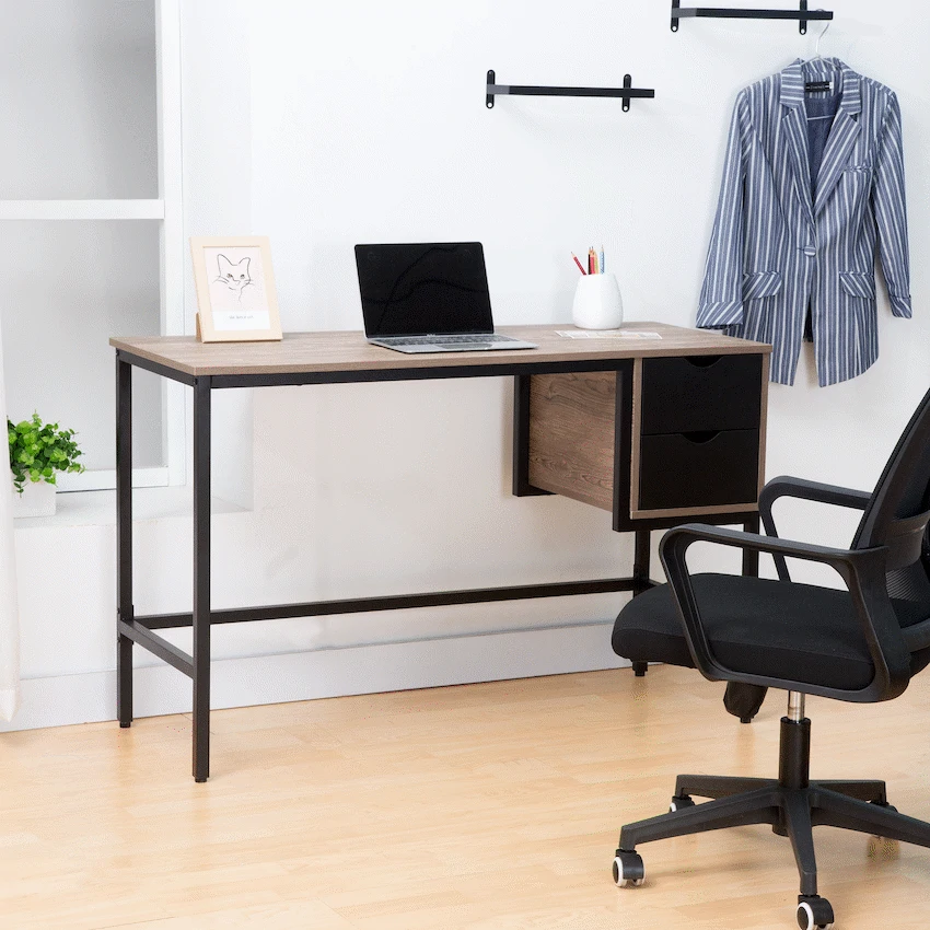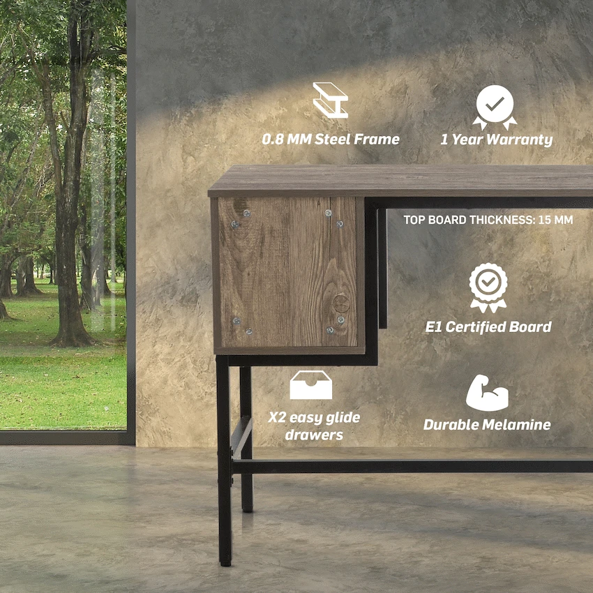 Upgrade your workspace with the Everfurn Rampart Modern Office Desk, a practical and stylish solution designed for today’s home office. Combining a clean-lined silhouette with functional storage, this engineered wood office desk offers the ideal balance between productivity and modern design. The spacious desktop provides ample room for laptops, monitors, and daily work essentials, while the two integrated drawers keep stationery, documents, and accessories neatly stored and out of sight. Crafted from E1 PB board with a durable melamine finish, the surface is resistant to everyday wear, making it suitable for regular use in busy work environments. A powder-coated steel frame adds strength and stability, reinforced with a 0.8mm steel construction for long-lasting support. Adjustable feet ensure the desk stays level on uneven floors while helping to protect floor surfaces. Finished with PVC edging for added impact resistance, this computer desk with storage drawers is built to maintain its structure and appearance over time. Whether you’re setting up a dedicated home office or upgrading a study area, the Everfurn Rampart desk delivers a modern look, reliable durability, and convenient storage in one streamlined design. Feature Highlights Two Integrated Drawers – Keep office essentials organised and within easy reach Durable Melamine Surface – Resists everyday scratches and wear Powder-Coated Steel Frame – Provides strong, stable support Adjustable Feet – Ensures stability on uneven surfaces and protects floors Engineered Wood Construction – E1 PB board for reliable daily use PVC Edge Protection – Helps prevent damage from knocks and impact Technical Specifications Material: E1 PB Board (Engineered Wood) Finish: Melamine with PVC Edging Frame: Powder-Coated Steel (0.8mm) Top Board Thickness: 15mm Dimensions: 120cm × 48cm × 76cm Weight: 23kg Warranty: 1 Year What’s in the Box 1 × Everfurn Rampart Office Desk 1 × Instruction Manual Create a refined and organised workspace with a modern home office desk designed to support your productivity—day after day. Durable Melamine Powder Coated Steel Frame 0.8 mm Steel Frame Top Board Thickness: 15 mm PVC Edging 4pc Adjustable Feet x2 Drawers