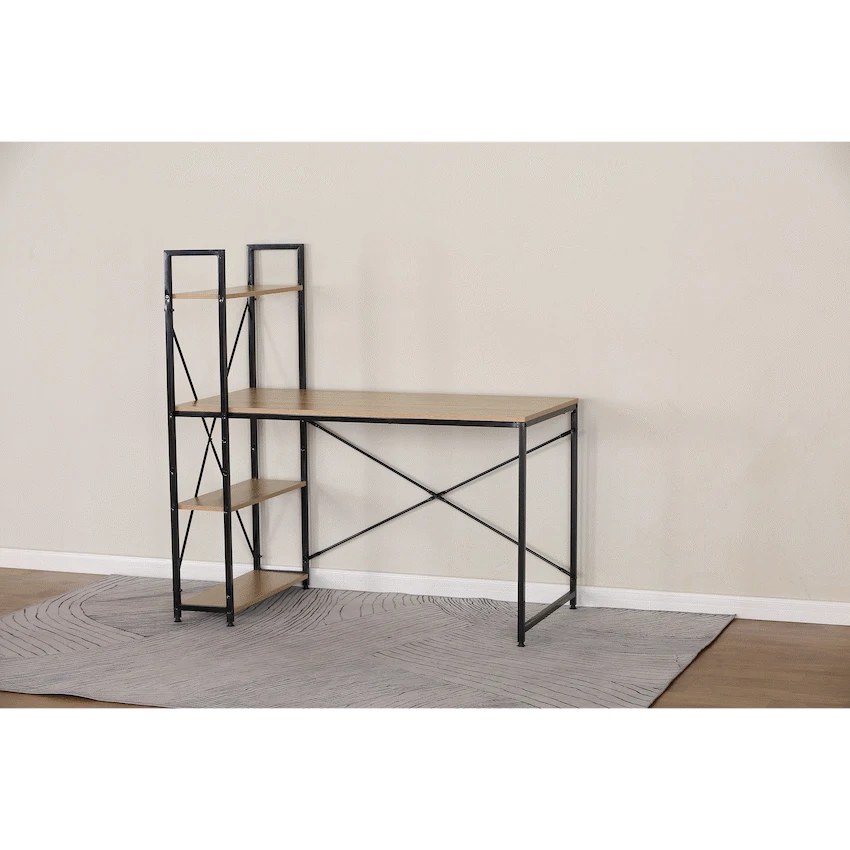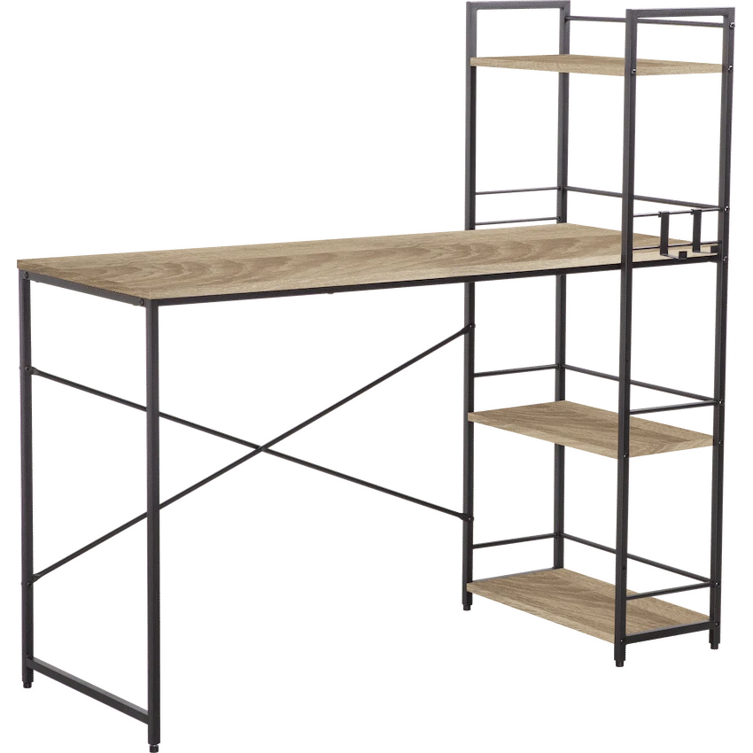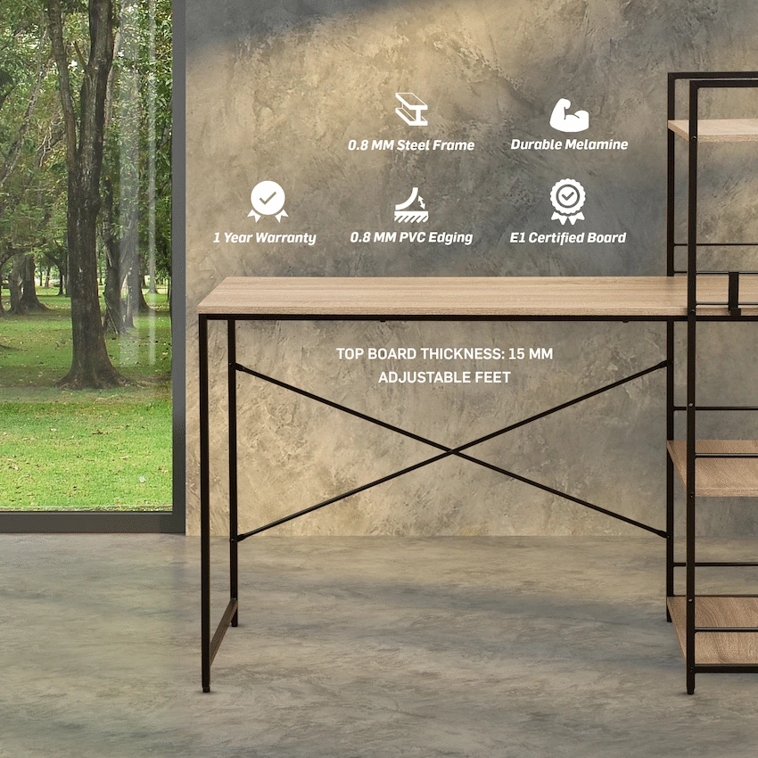 Create a productive and organised workspace with the Everfurn Regal Study Desk with Bookshelf, designed to combine modern style with practical storage. Ideal for home offices, student rooms, or compact workspaces, this computer desk with storage makes it easy to keep essentials within reach while maximising vertical space. The integrated tiered bookshelf provides generous storage for books, files, and décor, helping you maintain a clutter-free desk surface. Crafted from durable engineered wood with a protective melamine finish, the desktop is resistant to everyday water splashes and scratches, making it suitable for daily use. The powder-coated steel frame, reinforced with a cross-bracing design, delivers reliable stability, while adjustable feet ensure the desk stays level on uneven floors. Thoughtful details such as movable storage hooks add flexibility, allowing you to hang headphones, bags, or accessories exactly where you need them. With a clean, modern look and practical construction, this home office desk furniture piece fits seamlessly into contemporary interiors while offering the strength and functionality required for work or study. Feature Highlights Integrated Tiered Bookshelf – Vertical storage keeps books and essentials neatly organised Movable Storage Hooks – Two adjustable hooks provide flexible hanging space Stable Cross-Braced Steel Frame – Enhances strength and workspace security Adjustable Feet – Ensures stability on uneven surfaces while protecting floors Durable Melamine Surface – Water- and scratch-resistant for everyday use Powder-Coated Steel Legs – Rust- and scratch-resistant for long-lasting durability PVC Edge Protection – Guards against impact and wear High Load Capacity – Supports up to 30kg overall and 10kg per shelf Technical Specifications Material: Engineered Wood (PB Board) Finish: Melamine Lamination with PVC Edging Frame: Powder-Coated Steel (0.8mm) Board Thickness: 15mm (Top and Sides) Maximum Load Capacity: 30kg Shelf Load Capacity: 10kg per Shelf Dimensions: 1200mm x 510mm x 1200mm Weight: 16.6kg Warranty: 1 Year What’s in the Box 1 × Everfurn Regal Desk 1 × Instruction Manual Upgrade your workspace with a modern study desk that balances smart storage, durability, and contemporary design—perfect for staying organised and focused every day. Multiple integrated tiered bookshelf offers vertical storage to keep your workspace organized. 2x Movable storage hooks can be positioned to suit your needs, offering flexible hanging space. Adjustable feet, allow for leveling the desk on uneven surfaces, ensuring stability and protecting floors. Cross-bracing frame design, enhances structural stability, ensuring a secure workspace. Rust-and scratch resistant powder coated steel legs. Water-and scratch resistant durable melamine lamination. PVC-edging protects the desk from impact. 10kg Weight capacity per shelf. 30kg Weight capacity. 1 Year Warranty.