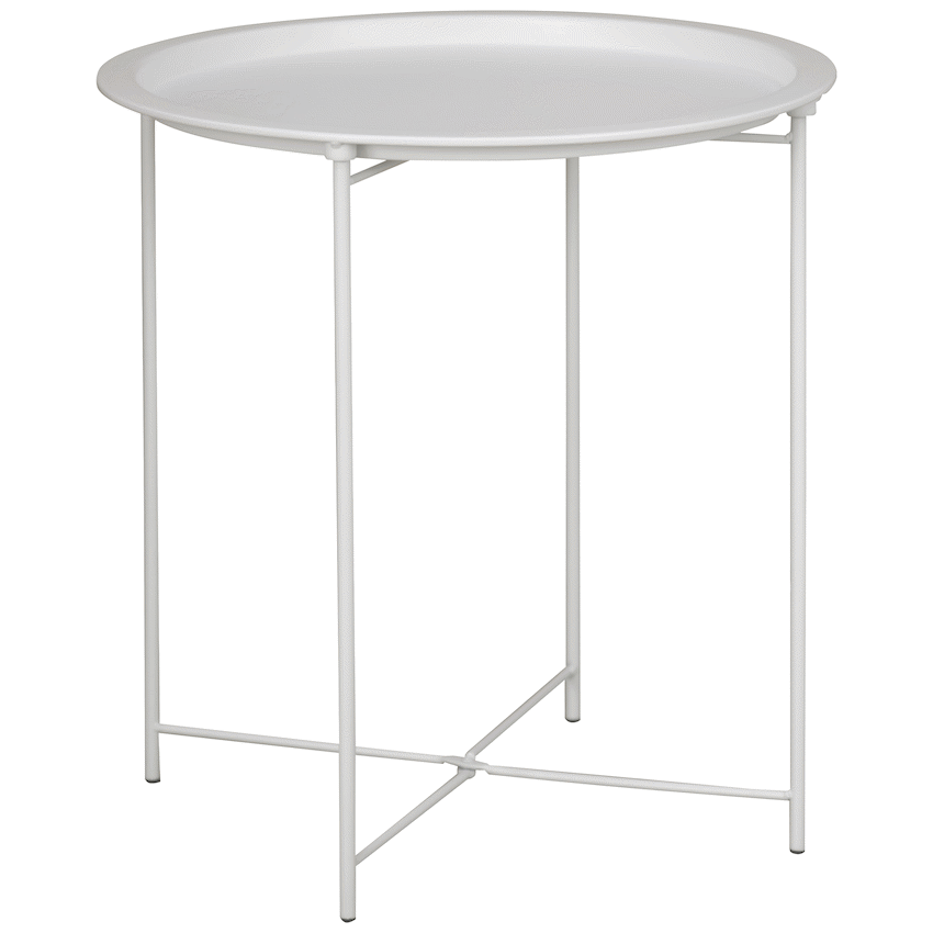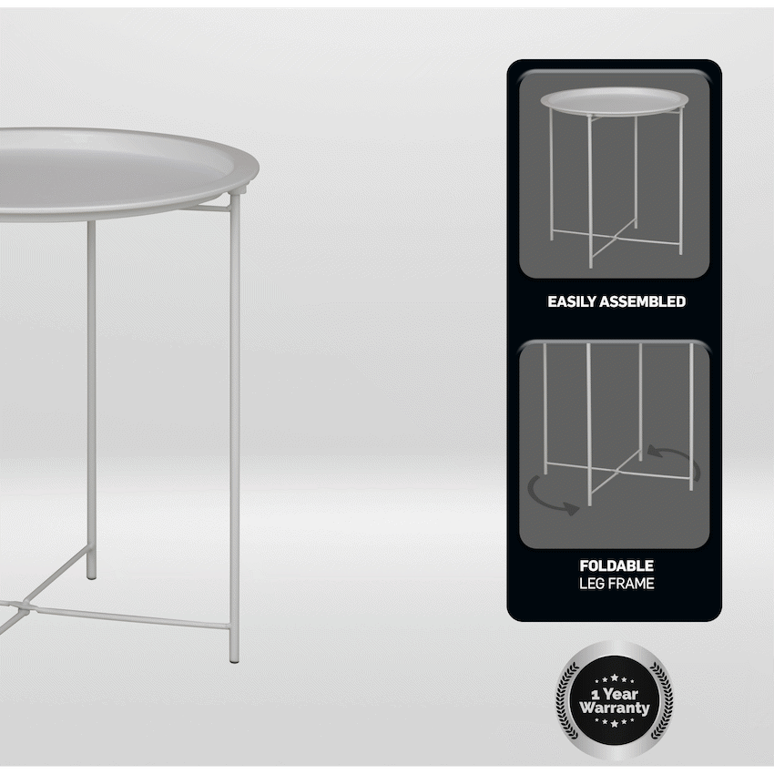 Mira Side Table – White – 2 pack Foldable steel legs, allow for quick setup and compact flat storage, ideal for flexible use in small spaces. Crossbar frame design ensures stability while in use. Floor protection feet prevent scratches and scuffs to your floor, while keeping the side table from slipping. Rust resistant painted steel. 1 Year Warranty.