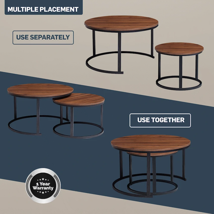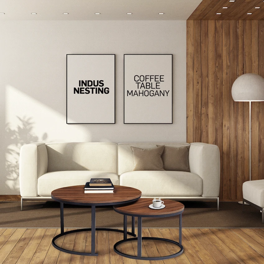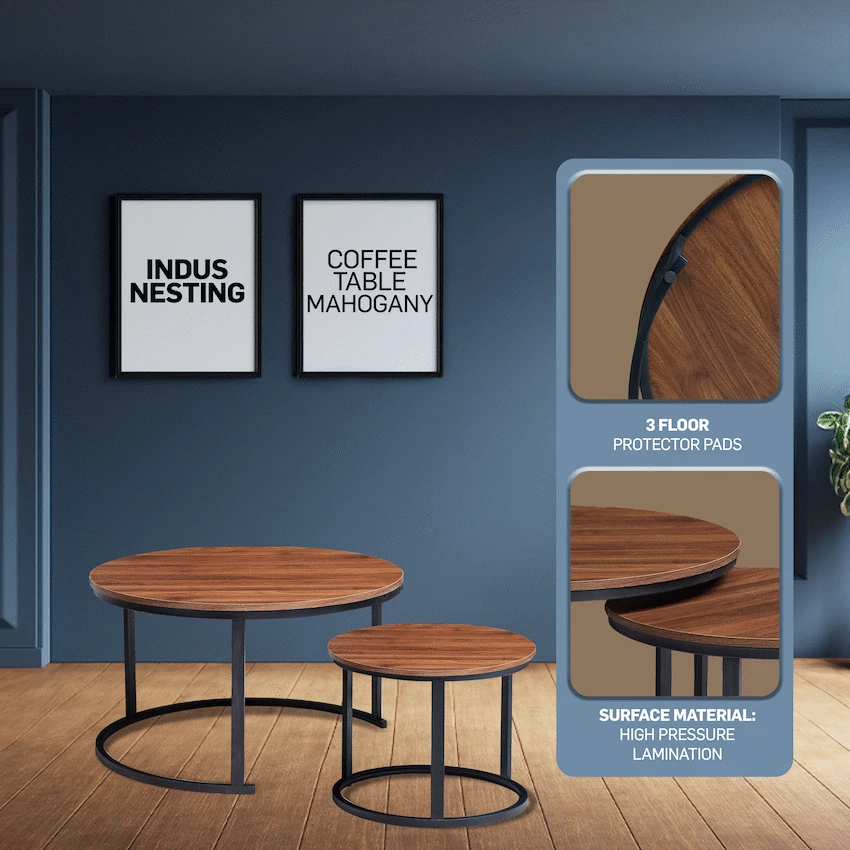 Elevate your living space with the Everfurn Indus Nesting Coffee Table Set, a versatile and stylish addition to any home. This modern coffee table set includes two tables that nest seamlessly, giving you the flexibility to expand your tabletop space when needed or tuck away the smaller table for a clutter-free look. Crafted from engineered wood with a rich mahogany finish, the tables feature durable melamine lamination that is both water- and scratch-resistant, ensuring they stay looking pristine even with daily use. Powder-coated steel legs and frame provide a robust, rust-resistant foundation, while PVC-edged surfaces protect against bumps and impacts. Discreet floor protection pads safeguard your floors from scratches, making these tables practical as well as stylish. Ideal for modern living rooms, the set combines flexibility, durability, and elegance, making it perfect for entertaining guests or casual everyday use. Backed by a 1-year warranty, these tables are designed to give you long-lasting functionality and peace of mind. Whether nested for compact storage or separated for extra tabletop space, this 2-piece coffee table set brings both style and practicality to your home. Feature Highlights 2-PIECE NESTING DESIGN – Flexible tables that tuck away neatly or expand your space as needed. DURABLE CONSTRUCTION – Rust- and scratch-resistant powder-coated steel legs and frame. WATER-RESISTANT SURFACE – Melamine laminated tops keep tables protected from spills. FLOOR PROTECTION PADS – Prevent scratches and scuffs on delicate flooring. IMPACT-PROTECTED EDGES – PVC edging safeguards the tables from bumps. 1-YEAR WARRANTY – Confidence in quality and durability. Technical Specifications Material: Engineered Wood (PB Board) Lamination: Melamine with PVC-edging Steel Legs & Frame: Powder coated, 0.8mm steel Small Table: W600 x H380 x D600 mm Large Table: W800 x H450 x D800 mm Weight: 13 kg What’s in the Box 1 x Everfurn Indus Nesting Coffee Table Set (2 pieces) Instruction Manual Closing Line Stylish, durable, and space-saving—this modern mahogany coffee table set adapts to your lifestyle while keeping your living room elegant and organized. Set includes 2 nesting tables that allow you to tuck one under the other, offering flexible use. Discreet floor protection pads, prevents scratches and scuffing to your floors. Rust-and scratch resistant powder coated steel legs. Water-and scratch resistant durable melamine lamination. PVC-edging protects the desk from impact. 1 Year Warranty.